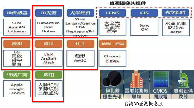圖一是 3D感測(cè)產(chǎn)業(yè)鏈的蘋果概念股,其中框上紅色外框的是VCSEL相關(guān)產(chǎn)業(yè),對(duì)于IR光源目前國(guó)內(nèi)一家華芯半導(dǎo)體公司可以完全自主生產(chǎn),并已實(shí)現(xiàn)商用。